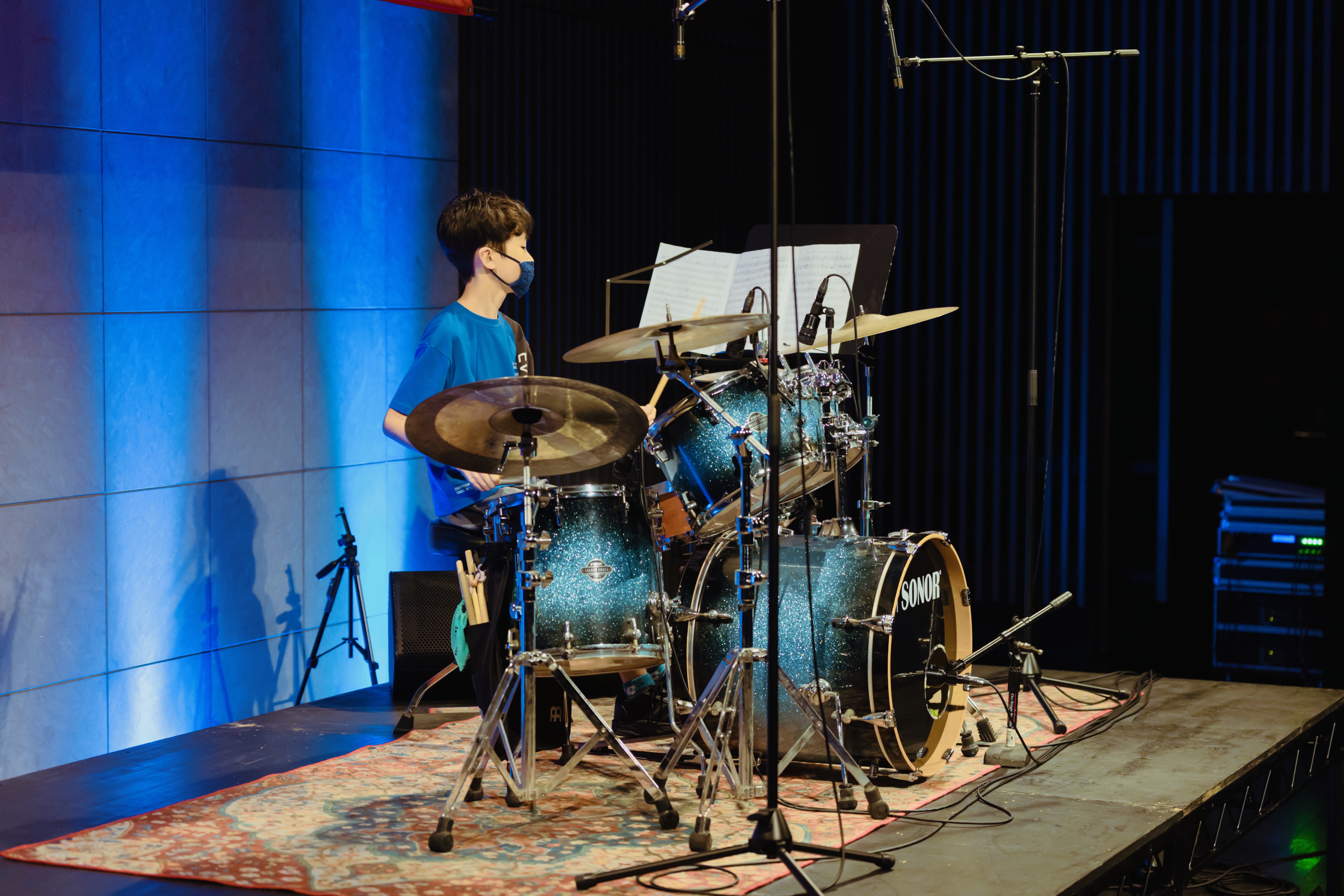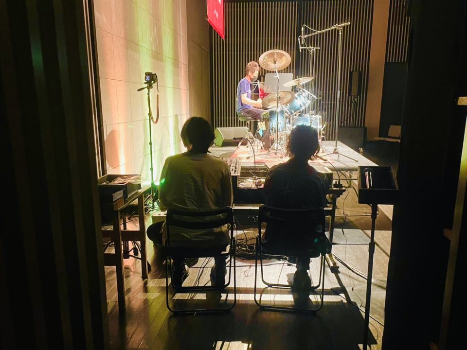 (ステージ脇の音響席で生徒さんの演奏を見守るカズハラダと、さばめし先生)