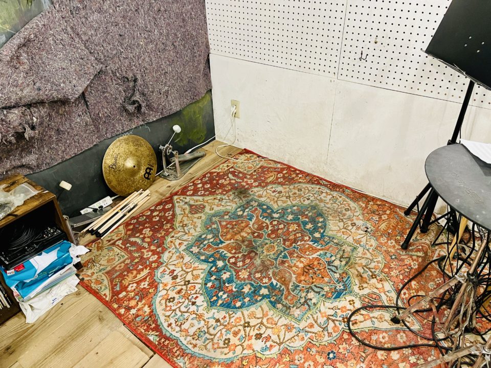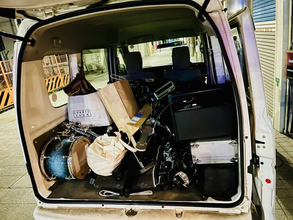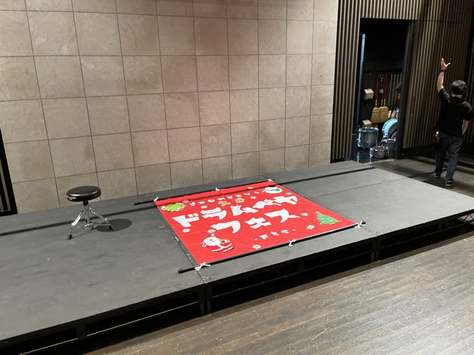 ➖会場へ到着し、ドラムセットやステージ後ろの垂れ幕をセッティング。